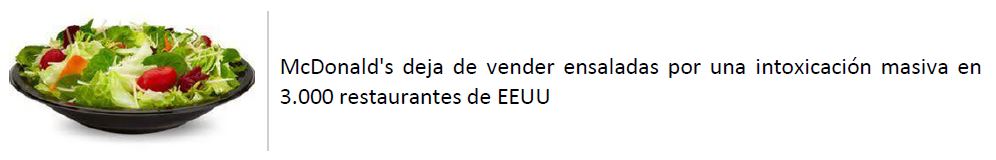 En EEUU en 2013 las ensaladas envasadas constituyeron el 25% de casos de intoxicaciones alimentarias y la segunda causa de hospitalización. En los años 90 la principal causa de ETA era la carne, pero en la actualidad, según los Centros para el Control y la Prevención de Enfermedades (Centers for Disease Control and Prevention - CDC) el 6% de las intoxicaciones provienen de mariscos o pescados, la mitad son causadas por la ingesta de vegetales, frutas, legumbres y coles y el resto se lo reparte la carne, lácteos, huevos y otros.